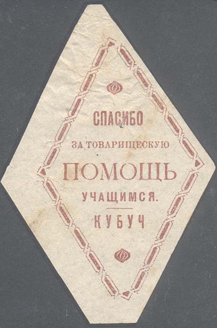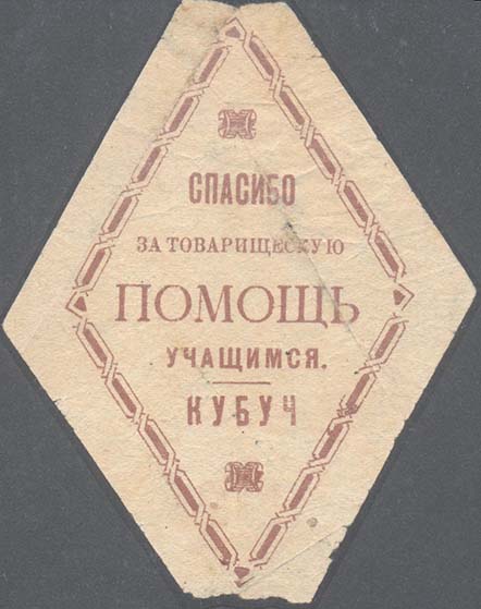 1925(?) г. Ромб разм. 70 х 130 мм. Одноцветная печать на светло-серой бумаге. В рамке в виде ромба разм. 58 х 88 мм в центе текст в пять строк: «Спасибо за товарищескую помощь учащимся. КУБУЧ». Сверху и снизу декоративные элементы.