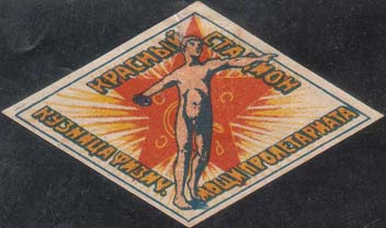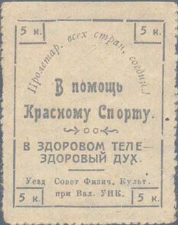 1925 г. Разм. рамки 37 х 46 мм. Одноцветная печать на желтоватой бумаге. Нерегулярная зубц. В центре в прямоугольной рамке текст в две строки: «В помощь Красному Спорту». Сверху полукругом текст: «Пролетар[ии]. Всех стран, соединяйтесь!». Внизу текст в две строки: «В здоровом теле – здоровый дух»…
