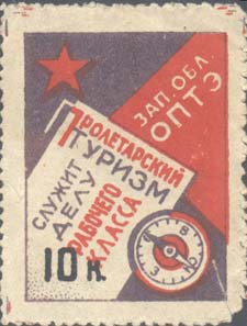 1930(?) г. Разм. рамки 31 х 41 мм. Трехцветная печать на кремовой бумаге. Зубц. 10. В прямоугольной рамке в левом верхнем углу пятиконечная звезда. В правом нижнем углу компас. В левом нижнем углу номинал. Текст: «Зап[адное]. Обл[астное]. ОПТЭ. Пролетарский туризм служит делу рабочего класса».
