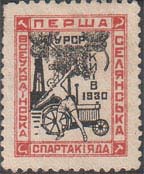 1930 г. Разм. рамки 19 х 23,5 мм. Двухцветная печать на белой бумаге. Зубц. Лин. 11 1/2. С клеем. В двойной прямоугольной рамке в центре спортсмен бросает копье. На заднем плане дымящие трубы и трактор. Текст на украинском языке в три строки: «УССР. Киев. 1930». По периметру между рамками текст н…