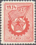 1934 г. Разм рамки 20 х 27 мм. Одноцветная печать на белой бумаге. Зубц. 11 1/2. с клеем. В центре в двойной прямоугольной рамке с закругленными углами значок красного спортивного интернационала. В левом верхнем углу дата: «1934». Внизу аббревиатура «КСИ» на русском, французском и немецком языках.