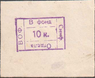 1932 г. Разм. рамки 56 х 45 мм. Одноцветная печать на бумаге различных цветов. В центре фиолетовый оттиск ручного прямоугольного штампа разм. 29 х 19 мм. В центре штампа номинал. По внутреннему периметру штампа текст: «В фонд Симф[еропольского]. Отдела ВОФ».