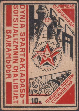 1932 г. Разм. рамки 53 х 74 мм. Двухцветная печать на желтоватой бумаге. В толстой прямоугольной рамке слева значок БГТО на фоне заводских построек. Текст в четыре строки: «Мировая спартакиада праздник победы социализма». Внизу номинал. Слева вертикально сверху вниз текст в три строки на татарско…