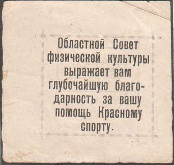 1930(?) г. Разм. рамки 56 х 54 мм. Одноцветная двухсторонняя печать на белой бумаге. На лицевой стороне в прямоугольной рамке разм. 37,5 х 33 мм текст семь строк: «Областной Совет физической культуры выражает вам глубочайшую благодарность за вашу помощь Красному спорту». На оборотной стороне стил…