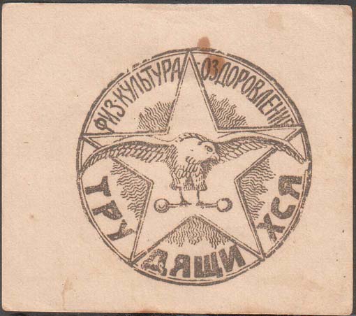 1924(?) г. . Разм. 85 х 74 мм. Одноцветная печать на кремовой бумаге. На лицевой стороне в двойной круглой рамке диаметром 57 мм значок – орел, держащий в лапах штангу на фоне пятиконечной звезды. По внутреннему периметру рамки текст: «Физкультура – оздоровление трудящихся». На оборотной стороне …