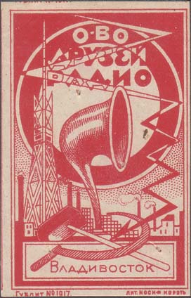 1928(?) г. Разм. рамки 43 х 67 мм. Одноцветная печать на белой бумаге. В центре в прямоугольной рамке завод, радиомачта и репродуктор и зигзагообразная стрела. Сверху на фоне громкоговорителя текст в три строки: «Общество Друзей Радио». Внизу в прямоугольной рамке скрещенные серп и молот и текст:…