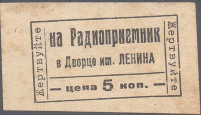 1932 г. Разм. 67 х 37 мм. Одноцветная печать на желтоватой бумаге. В центре в прямоугольной рамке разм. 50 х 28 мм сверху текст в две строки: «На радиоприемник во дворце им. Ленина». Внизу под горизонтальной чертой номинал: «Цена 5 коп.». Слева и справа вертикально тексты: «Жертвуйте».