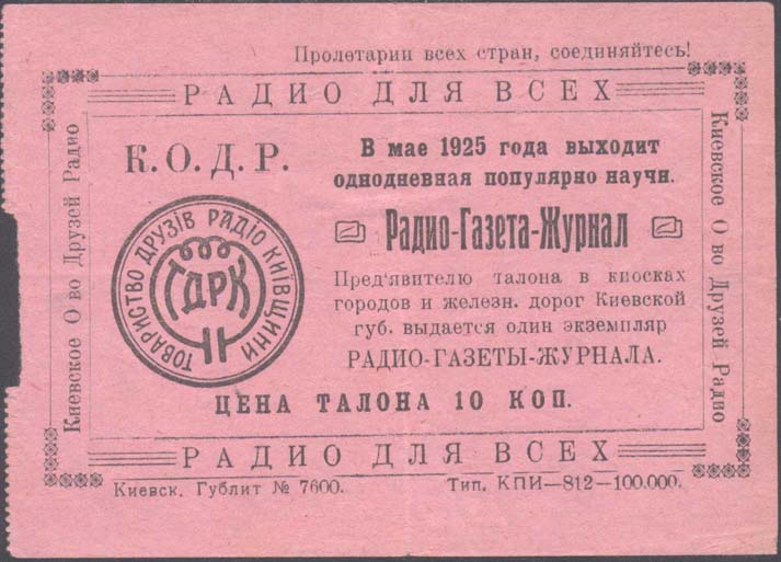 1925 г. Листок из квитанционной книжки разм. 119 х 85 мм. Одноцветная печать на тонкой розовой бума-ге. Левосторонняя Зубц. 11 1/2. В двойной прямоугольной рамке с декоративными элементами по углам справа текст в семь строк: «В мае 1925 года выходит однодневная популярно научн[ая]. Радио-Газета-Ж…