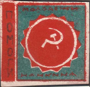 1926 г. Разм. 53 х 48 мм. Двухцветная печать на плотной белой бумаге. Слева вертикальная полоса разм. 8 х 46 мм с текстом: «Помоги». Справа в прямоугольной рамке разм. 40 х 46 мм в центре многолучевая звезда с серпом и мо-лотом в круглой рамке. Сверху продолжение текста «Молодежи». Внизу продолже…