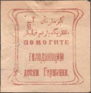 1927(?) г. Разм. 54 х 58 мм. Одноцветная печать на плотной кремовой бумаге. В декоративной рамке разм. 44 х 45 мм сверху текст в две строки на татарском языке арабским шрифтом. Ниже текст в три строки: «Помогите голодающим детям Германии».
