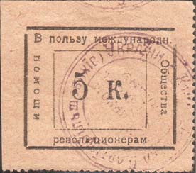 1926(?) г. Разм. по перфорации 46 х 40 мм. Одноцветная печать на желтоватой бумаге. Зубц. 11 1/2. В двойной прямоугольной рамке разм. 36 х 29 мм в центре номинал. По периметру между рамками текст: «В пользу международ[ного]. Общества помощи революционерам». На лицевой стороне фиолетовый оттиск кр…
