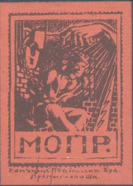 1926(?) г. Разм. 45 х 63 мм. Одноцветная печать на бумаге различных цветов. В прямоугольной рамке разм. 39 х 54 мм аллегорический рисунок: узник разрывает цепи на фоне стены и решетки. Рука с молотком сбивает замок. Внизу аббревиатура «МОПР». Внизу под рамкой мелким шрифтом текст в две строки на …