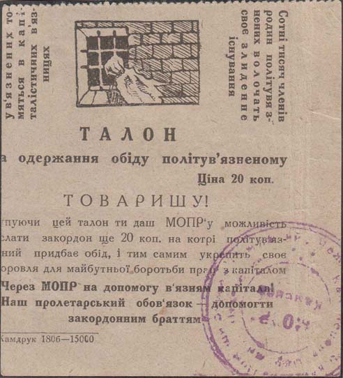 1930 г. Листок из квитанционной книжки разм. 80 х 90 мм. Одноцветная печать на серо-зеленой бу-маге. Сверху зубц. 11 1/2. В центре текст в десять строк на украинском языке: «Талон на получение обеда политзаключенному. Цена 20 коп. Товарищ! Покупая этот талон ты даешь МОПРу возможность послать за …