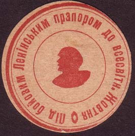 1930(?) г. Круг диаметром 44 мм. Одноцветная печать на желтоватой бумаге. В тройной круглой рамке диаметром 43 мм в центре силуэт В.И.Ленина. По периметру между рамками текст на украинском языке: «Под боевым Ленинским знаменем к всемирн[ому]. Октябрю».