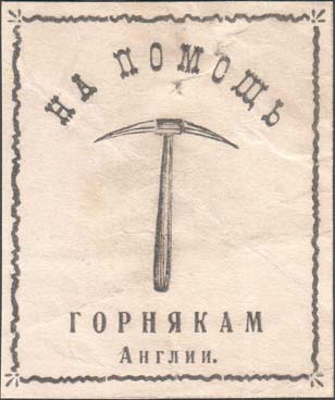 1926 г. 07.07.1926 г. Разм. рамки 47 х 55 мм. Одноцветная печать на белой плотной бумаге. В прямоугольной рамке из волнистых линий в центре кирка. Сверху полукругом текст: «На помощь!». Внизу продолжение текста в две строки: «Горнякам Англии».