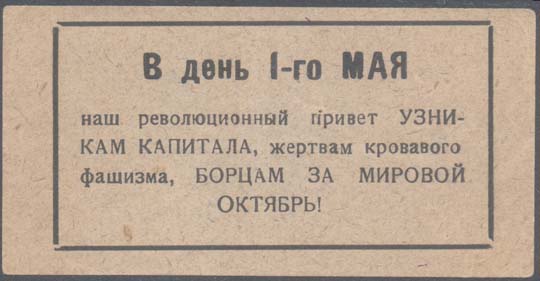 1929 г. Разм. 88 х 44 мм Одноцветная печать на бумаге различных цветов. В прямоугольной рамке разм. 72 х 38 мм текст в пять строк: «В день 1-го мая наш революционный привет узникам капитала, жертвам кровавого фашизма, борцам за мировой октябрь!».