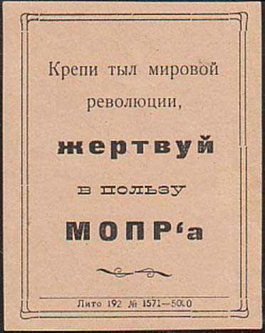 1930(?) г. Разм. рамки 53 х 71 мм. Одноцветная печать на желтоватой бумаге. В двойной прямоугольной рамке с декоративными элементами по углам текст в пять строк: «Крепи тыл мировой революции, жертвуй в пользу МОПРа». Ниже декоративный элемент. Внизу под чертой выходные данные мелким шрифтом: «Лит…