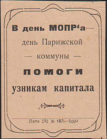 1930(?) г. Разм. рамки 53 х 72 мм. Одноцветная печать на желтоватой бумаге. В двойной декоративной рамке сложной формы текст в пять строк: «В день МОПРа – день Парижской коммуны помоги узникам капитала». Ниже декоративный элемент. Внизу под чертой выходные данные мелким шрифтом: «Лито 192 №1571 -…