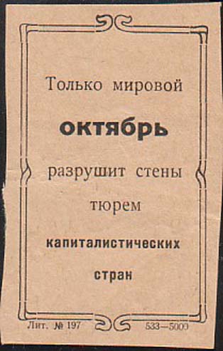 1930(?) г. Разм. рамки 44 х 75 мм. Одноцветная печать на желтоватой бумаге. В двойной декоративной рамке сложной формы текст в шесть строк: «Только мировой Октябрь разрушит стены тюрем капиталистических стран». Внизу под чертой выходные данные мелким шрифтом: «Лит. 197 533 - 5000».