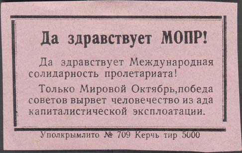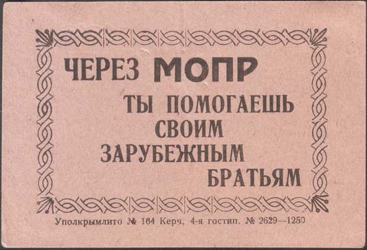1930(?) г. Разм. 80 х 58 мм. Одноцветная печать на плотной бумаге различных цветов. В прямо-угольной декоративной рамке в центре текст в пять строк: «Через МОПР ты помогаешь своим зарубежным братьям». Внизу под рамкой выходные данные мелким шрифтом: «Уполкрымлито №164 Керчь, 4-я гостип. № 2629-12…