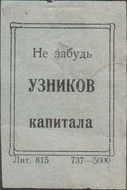 1930(?) г. Разм. 43 х 63 мм. Одноцветная печать на плотной серо-голубой бумаге. В двойной прямоугольной декоративной рамке разм. 34 х 43 мм текст в три строки: «Не забудь узников капитала». Внизу под рамкой выходные данные мелким шрифтом: «Лит. 815 737 - 5000».