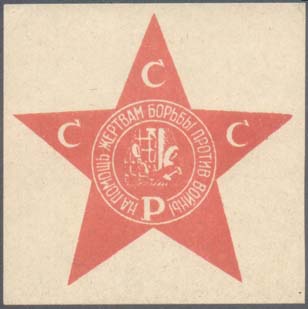 1930(?) г. Разм. 52 х 52 мм. Одноцветная печать на белой бумаге. В центре пятиконечная звезда разм. 46 х 47 мм с буквами аббревиатуры «СССР». В центре звезды в двойной круглой рамке диаметром 21 мм эмблема МОПР. По периметру между рамками текст: «На помощь жертвам борьбы против войны».