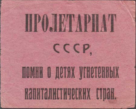 1930(?) г. Разм. 75 х 60 мм. Одноцветная печать на розовой бумаге. В центре текст в четыре строки: «Пролетариат СССР, помни о детях угнетенных капиталистических стран».