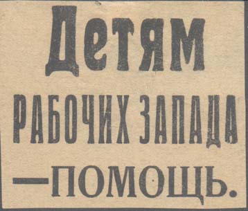 1930(?) г. Разм. 75 х 60 мм. Одноцветная печать на бумаге различных цветов. В центре текст в три строки: «Детям рабочих Запада - помощь».