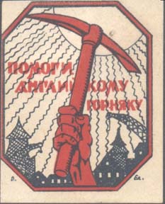 1930(?) г. Разм. 36 х 45 мм. Двухцветная печать на белой бумаге. В центре в восьмиугольной рамке на фоне шахты и восходящего солнца с лучами рука, держащая кирку. Текст в три строки: «Помоги английскому горняку». Слева и справа внизу буквы: «Л.» и «Бл.».