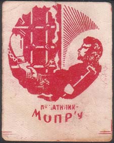 1930(?) г. Разм. 40 х 40 мм. Одноцветная печать на плотной белой бумаге. В центре эмблема МОПР.