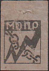 1930(?) г. Разм. 27 х 38 мм. Одноцветная печать на серой бумаге. В центре в двойной прямоугольной рамке разм. 20 х 24 мм молния, разрывающая цепь. Сверху аббревиатура «МОПР».