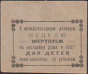 1930(?) г. Разм. 50 х 40 мм. Одноцветная печать на серо-зеленой бумаге. В прямоугольной рамке разм. 38 х 25 мм с декоративными элементами в виде кружков по углам текст в шесть строк: «В международную детскую неделю жертвуем на постройку дома в СССР для детей политзаключен[ых]. за рубежом».