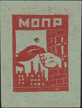 1930(?) г. Разм. 55 х 71 мм. Одноцветная печать на серо-зеленой бумаге. В прямоугольной рамке разм. 38 х 51 мм с рука с платком, просунутая сквозь тюремную решетку из углового окна. На заднем плане индустриальный пейзаж. Сверху аббревиатура «МОПР».