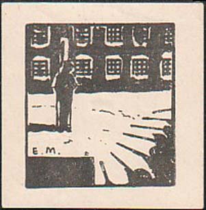 1930(?) г. Разм. 50 х 51 мм. Одноцветная печать на белой бумаге. В центре в прямоугольной рамке разм. 37 х 40,5 мм на фоне тюрьмы силуэт расстреливаемого узника. В левом нижнем углу аббревиатура «Е.М.».