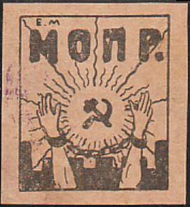 1930(?) г. Разм. 60 х 62 мм. Одноцветная печать на розовой бумаге. В центре эмблема МОПР. Внизу текст в две строки: «Протяни через решетку руку помощи борцам революции».