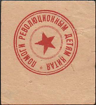 1930(?) г. Разм. 54 х 59 мм. Одноцветная печать на желтоватой бумаге. В тройной круглой рамке диаметром 37 мм в центре пятиконечная звезда. По периметру между рамками текст: «Помоги революционным детям Китая».