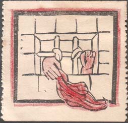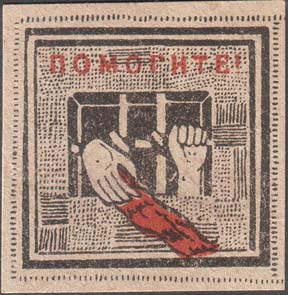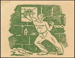 1930(?) г. Разм. 44 х 34 мм. Одноцветная печать на желтоватой бумаге. В центре в тюремной камере прикованный рабочий тянется правой рукой к окну.