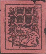 1930(?) г. Разм. 31 х 37 мм. Одноцветная печать на серо-красно-карминовой бумаге. В центре в прямоугольной рамке разм. 22 х 26 мм эмблема МОПР.