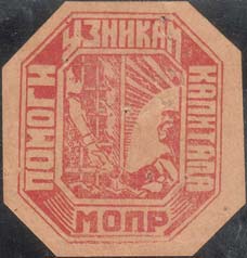 1930 г. Разм. 38 х 42 мм. Двухцветная печать на плотной белой бумаге. Нерегулярная вертикальная зубц. В центре в прямоугольной рамке эмблема МОПР.