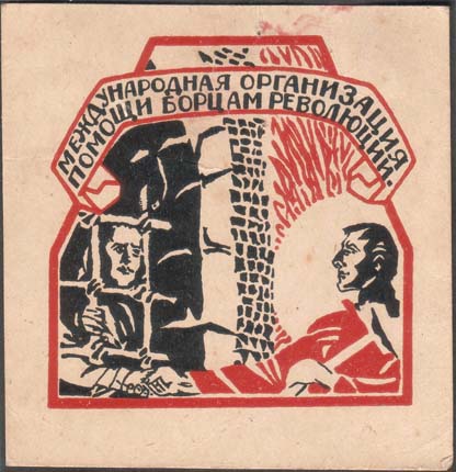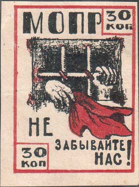 1930(?) г. Разм. 60 х 60 мм. Одноцветная печать на серо-коричневой бумаге. В центре в круглой рамке диаметром 45 мм аллегорический рисунок: рабочий выводит из тюрьмы узника в цепях. Сверху аббревиатура: «МОПР».