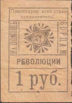 1930(?) г. Разм. 40 х 55 мм. Одноцветная печать на плотной желтоватой бумаге. В двойной прямоугольной рамке разм. 32 х 45 мм в центре пятиконечная звезда с серпом и молотом в центре. По периметру между рамками текст: «Пролетарии всех стран, соединяйтесь! На помощь борцам революции». Внизу в отдел…
