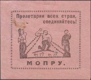 1930(?) г. Разм. 49 х 43 мм. Одноцветная печать на тонкой серо-розоватой бумаге. В прямоугольной декоративной рамке разм. 38 х 32 мм в центре аллегорический рисунок: рабочие в цепях и руки разрывающие цепи. Сверху текст в две строки: «Пролетарии всех стран, соединяйтесь!». Внизу текст: «МОПРу».