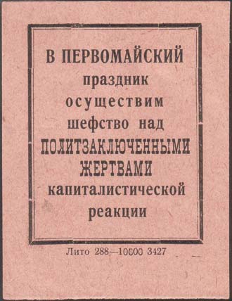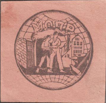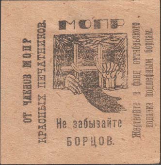 1930(?) г. Разм. 60 х 60 мм. Одноцветная печать на толстой желто-серой бумаге. В центре эмблема МОПР. По периметру текст: «МОПР. Не забывайте борцов. От членов МОПР красных печатников. Жертвуйте в фонд октябрьского подарка подшефным борцам».