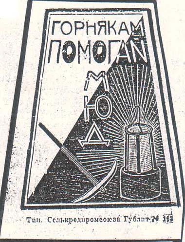 1930(?) г. Виньетка в форме трапеции разм. 67 х 83 мм. Одноцветная печать на лилово-розовой бумаге. В рамке в форме трапеции разм. 54 x 70 мм лампа и кирка. Сверху текст в три строки: «Горнякам помогай МЮД». Внизу под рамкой выходные данные мелким шрифтом: «Тип. Селькредпромсоюза Гублит. №167».