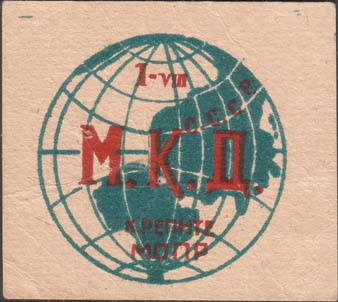 1930(?) г. Разм. 55 х 50 мм. Двухцветная печать на толстой желтоватой бумаге. В центре стилизованное изображение земного шара диаметром 42 мм на котором текст в четыре строки: «1-VIII. МКД Крепите МОПР».