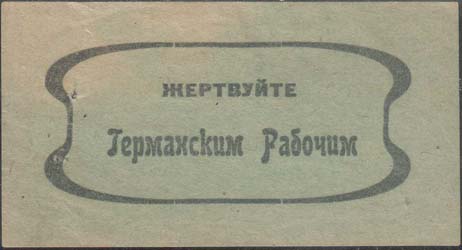 1930(?) г. 1930(?) г. Разм. 77 х 41 мм. Одноцветная печать на зелено-серой бумаге. В декоративной рамке разм. 62 х 27 мм в центре текст в две строки: «Жертвуйте Германским Рабочим».