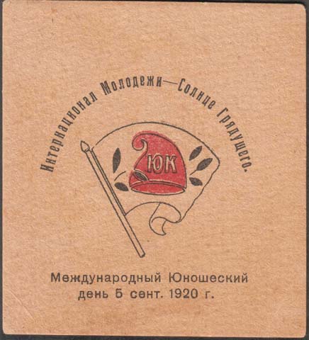 1920 г. 05.09.1920 г. Разм. 72 х 79 мм. Двухцветная печать на толстой желтоватой бумаге. В центре флаг с фригийским колпаком буквами «ЮК». Сверху полукругом текст: «Интернационал Молодежи – Солнце Грядущего». Внизу текст в две строки: «Международный Юношеский день 5 сент[ября]. 1920 г.».