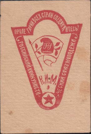 1921(?) г. Разм. 49 х 71 мм. Одноцветная печать на плотной желтоватой бумаге. В центре в фигурной рамке сложной формы разм. 40 х 54 мм заначек КИМ (ранний вариант). Внизу аббревиатура: «К.И.М.». По периметру на рамке текст: «Пролетарии всех стран, соединяйтесь! Российский коммунистический союз мо…