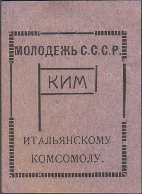 1930(?) г. Разм. 48 х 60 мм. Одноцветная печать на серо-синей бумаге. В прямоугольной декоративной рамке в центре флажок с аббревиатурой «КИМ». Сверху текст: «Молодежь СССР». Внизу продолжение текста в две строки: «Итальянскому комсомолу».