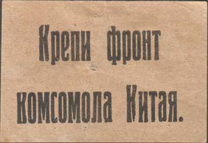1930(?) г. Разм. 50 х 35 мм. Одноцветная печать на желтовато-зеленой бумаге. В центре текст в две строки: «Крепи фронт комсомола Китая».